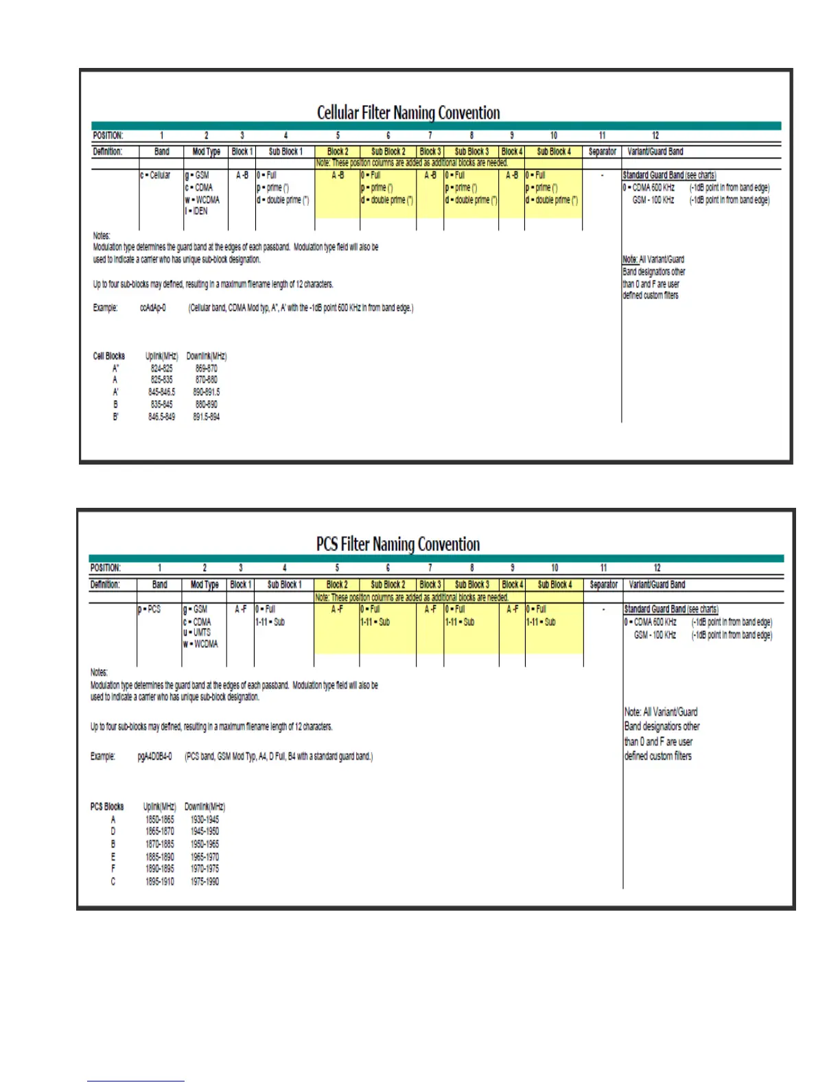 used to define the characteristics of the filter as shown above. All frequencies are shown in MHz