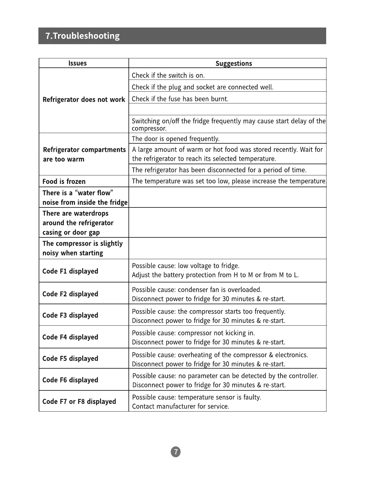 CSI W60 - Troubleshooting; Refrigerator Issues; Noise and Water Issues; Error Codes