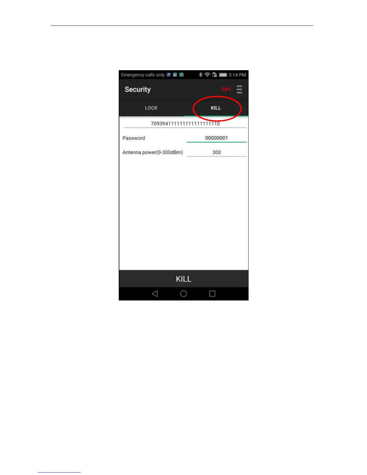 After entering the correct password, press KILL button at the bottom of the screen, the tag will