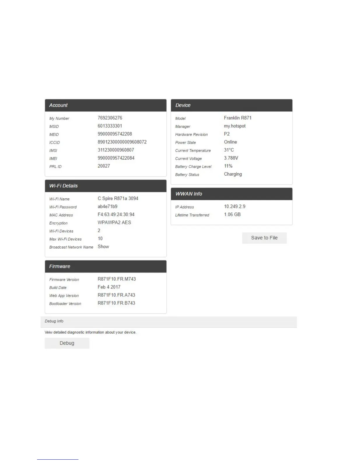 Show your device's connection information, firmware information, WWAN information, Wi-Fi details and