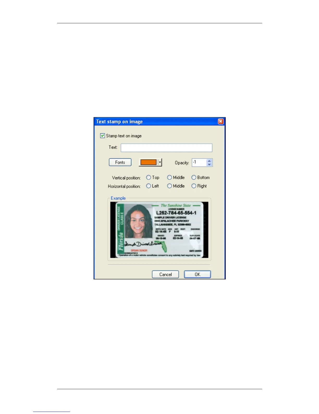The text stamp window allows you to add an automatic text stamp to the scanned