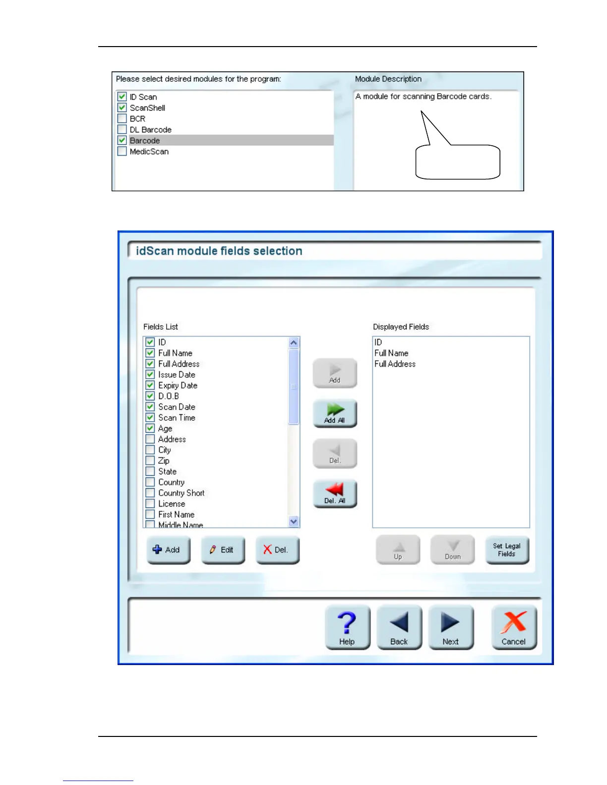 CSSN ScanShell 800 - Figure 6-2: Database Fields and Layout Fields Selection Window