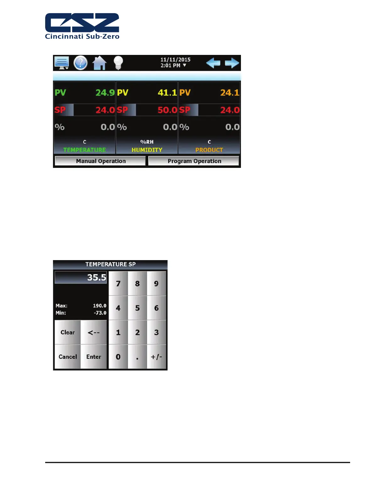 Press the numeric display for the setpoint (SP) for temperature. The setpoint adjust keypad will be