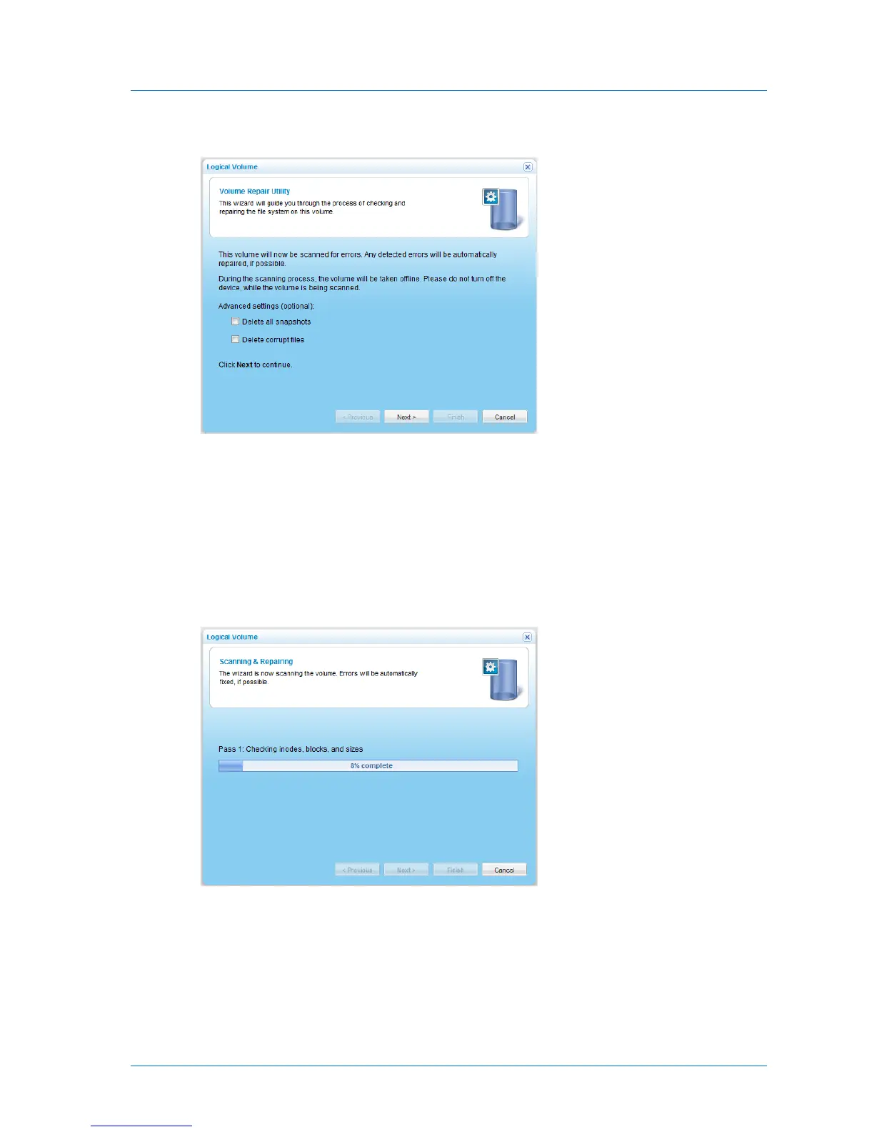The Logical Volume Wizard opens, displaying the Volume Repair Utility dialog box.