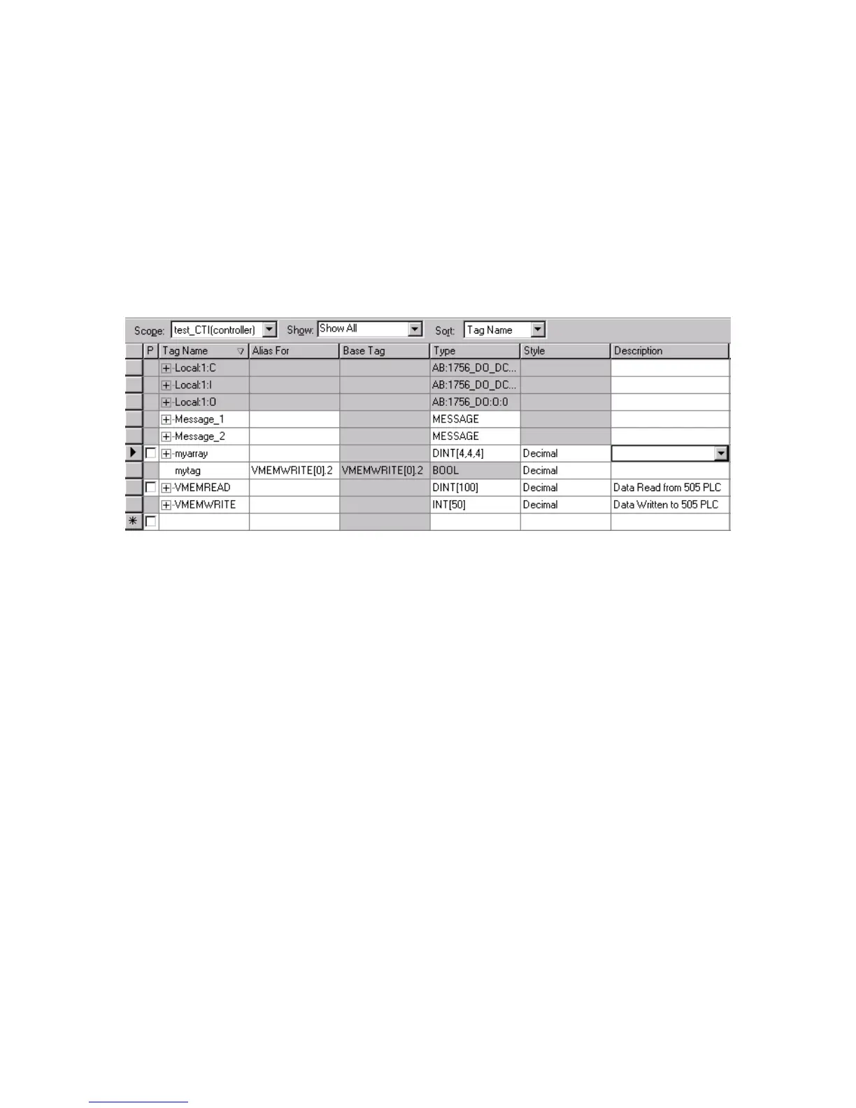The tag named VMEMWRITE will be used to store the data that will be written to the 505 PLC. Since we are