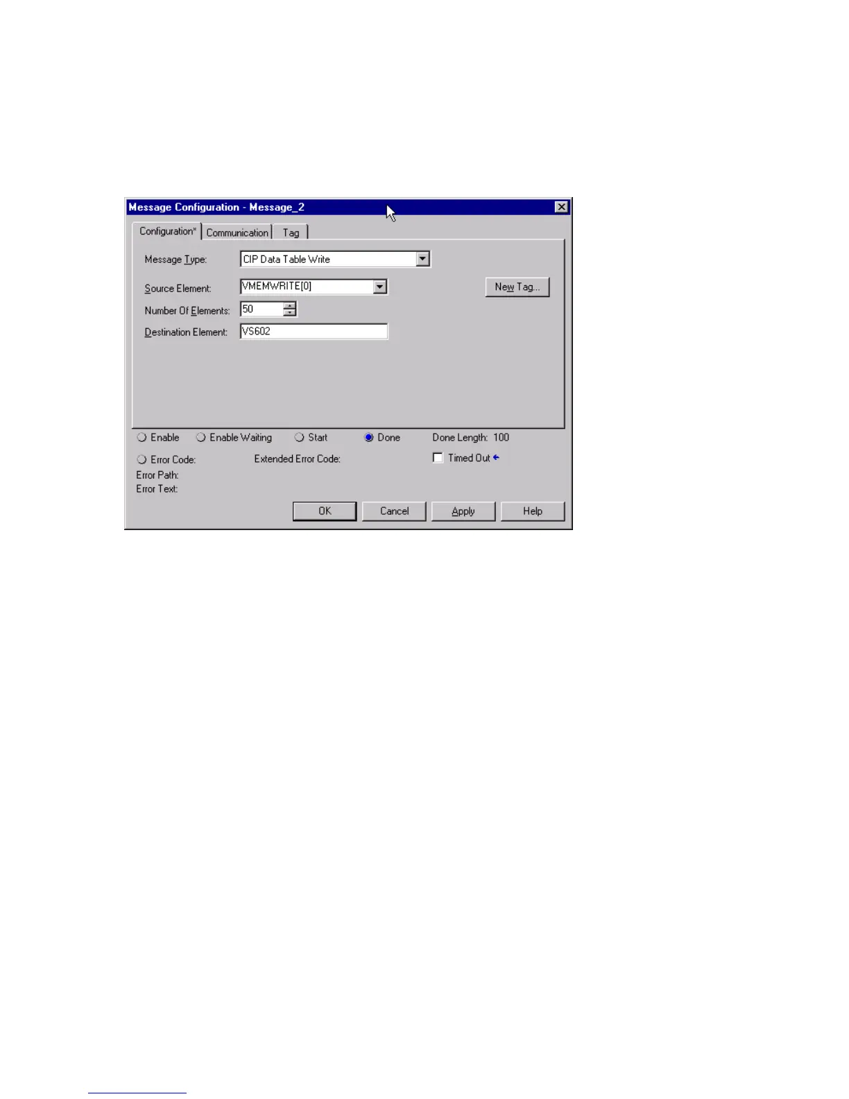Since we want to write a block of 50 registers, the NUMBER OF ELEMENTS will be set to 50.