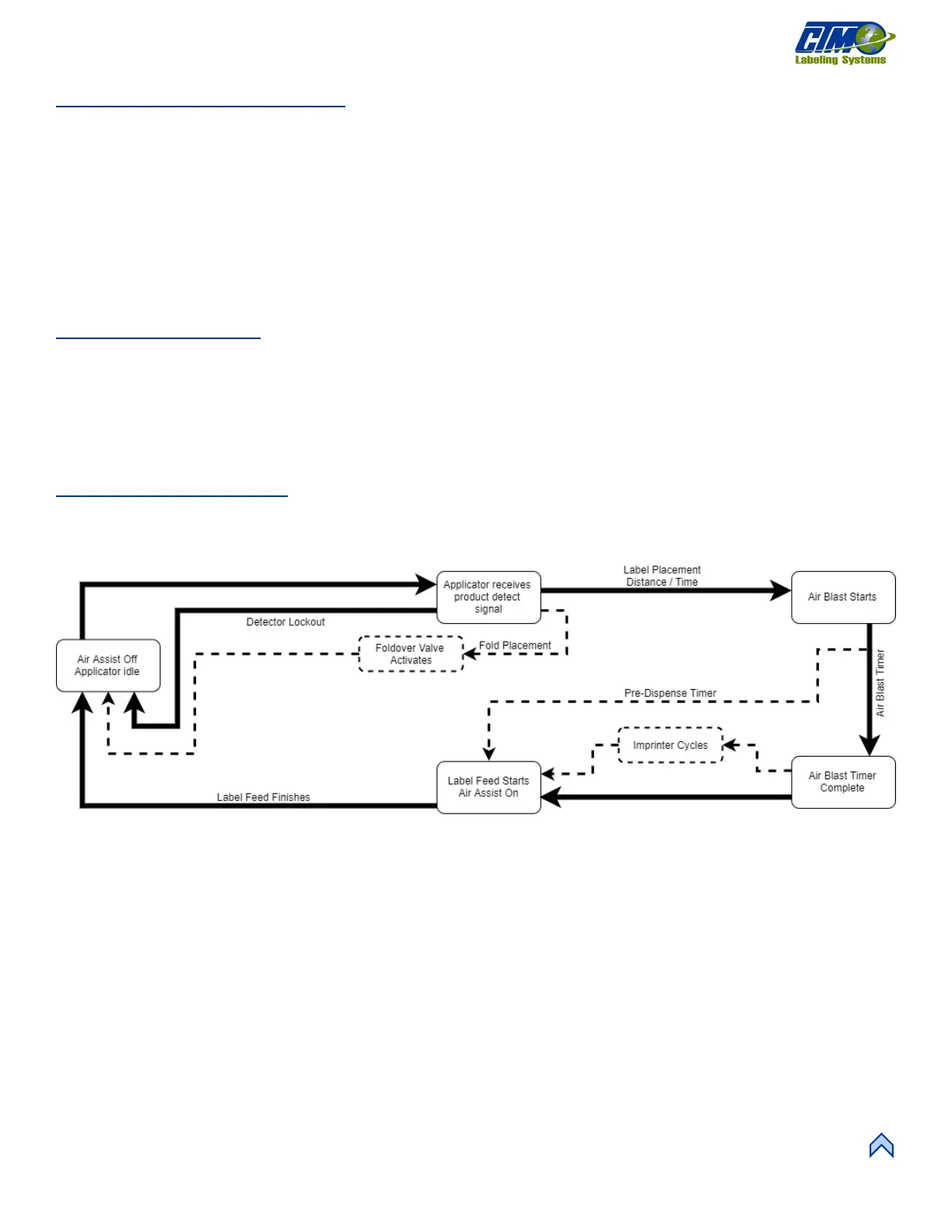 Figure [80] represents the cycle of an air blow applicator. Some cycle-affecting options are depicted by dotted lines. Any step that has
