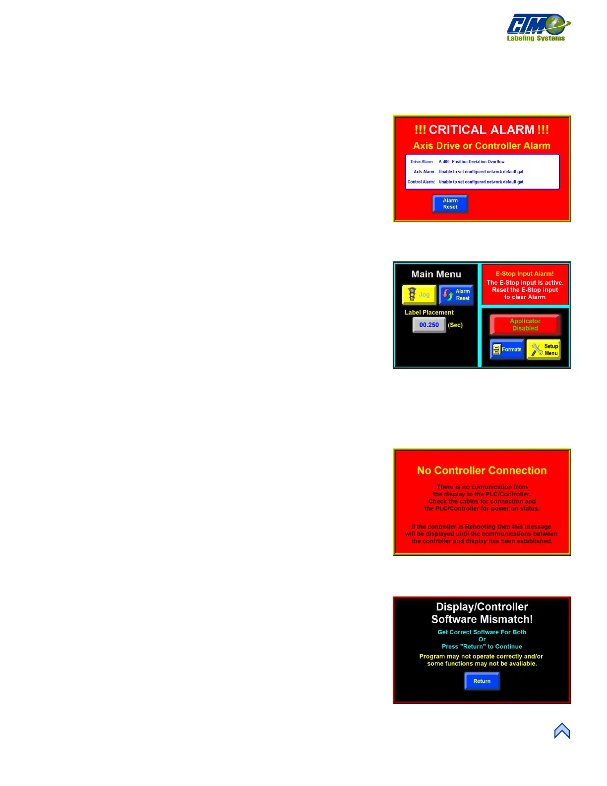 The operator interface displays warnings and alarms that pertain to the application. These alarms are more serious in nature than the