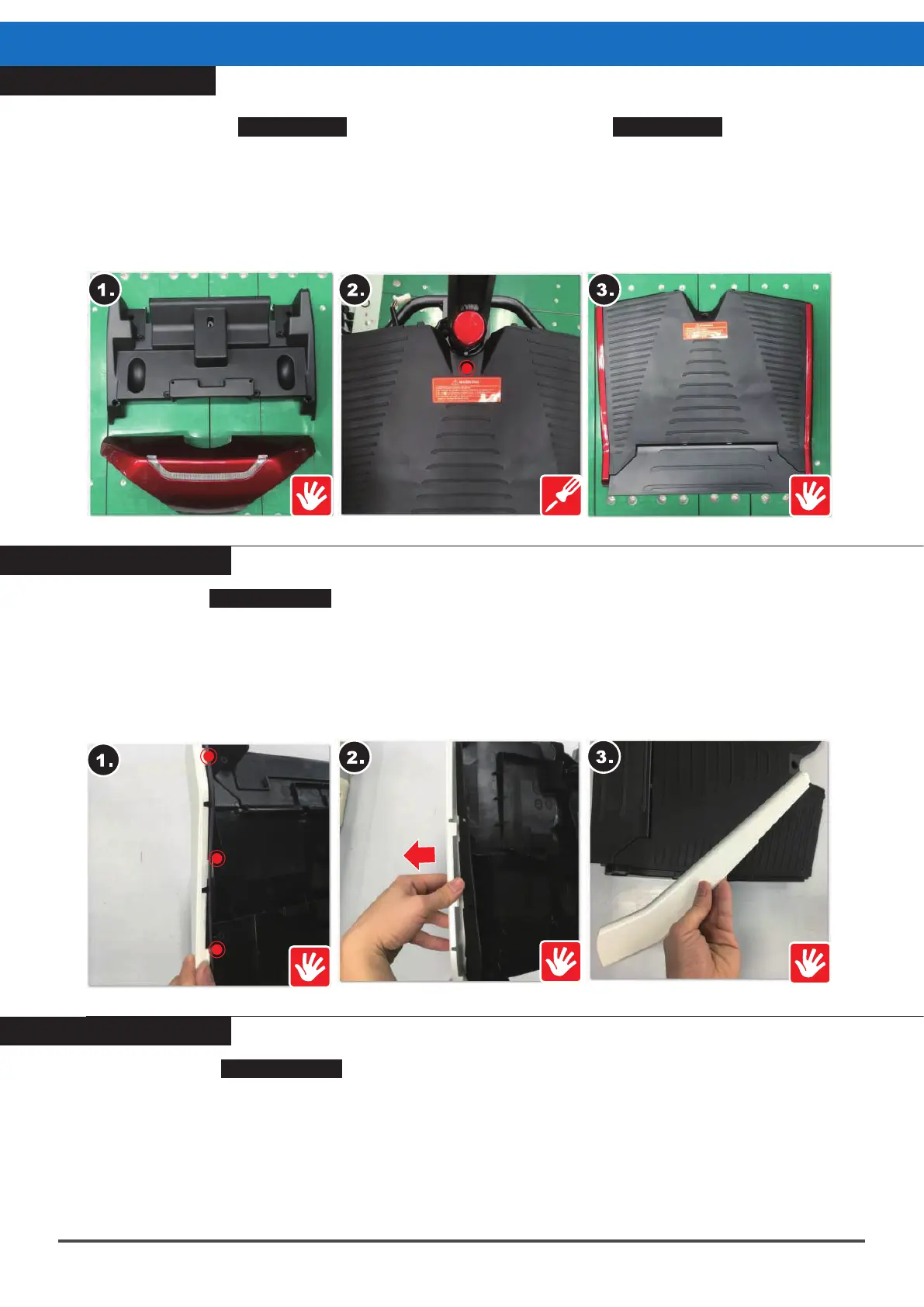 1.Find the three locking pins at the sides of the front lower cover - left and right side cover.