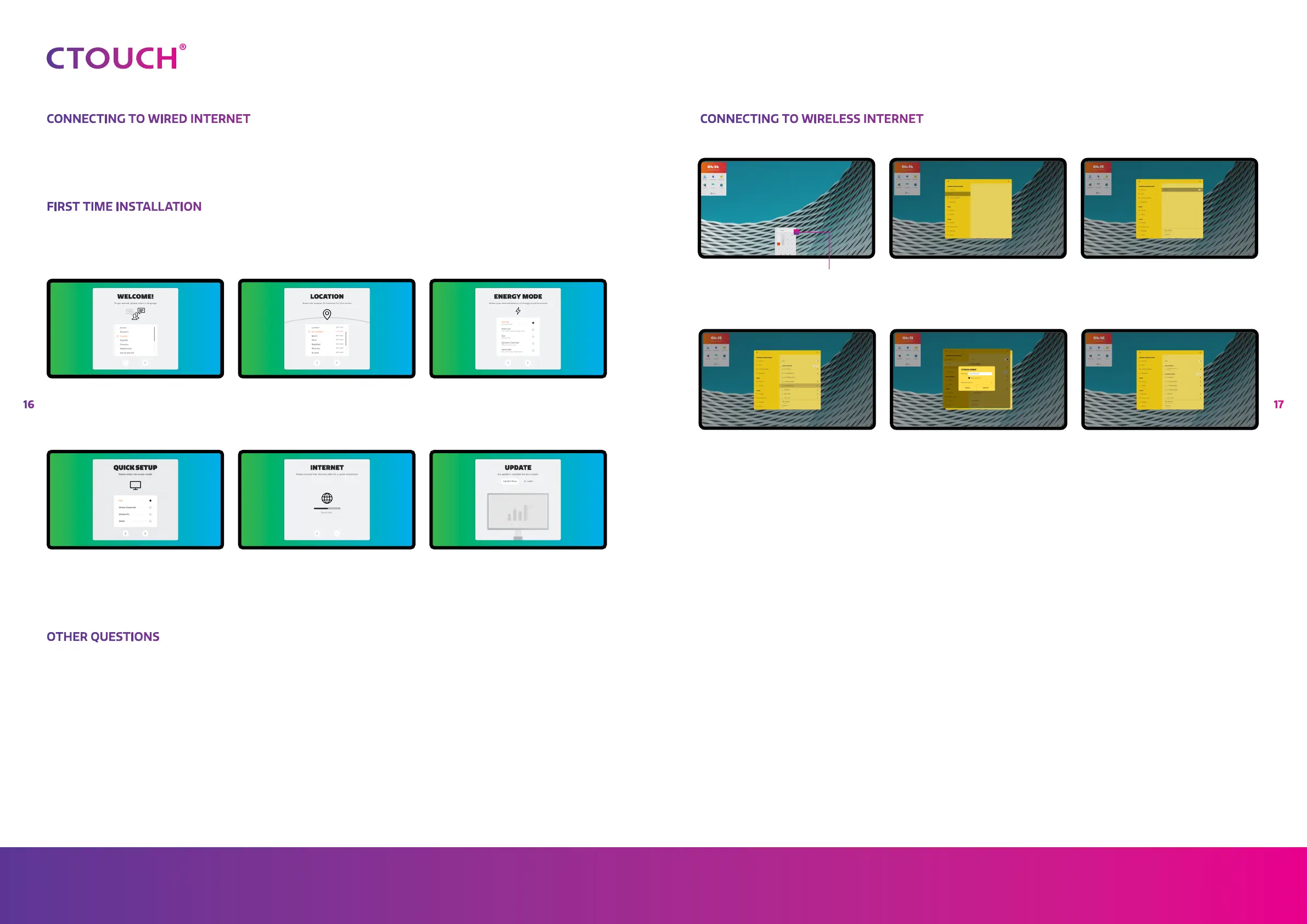 When turning on the CTOUCH display for the first time, the below shown installation menu pages