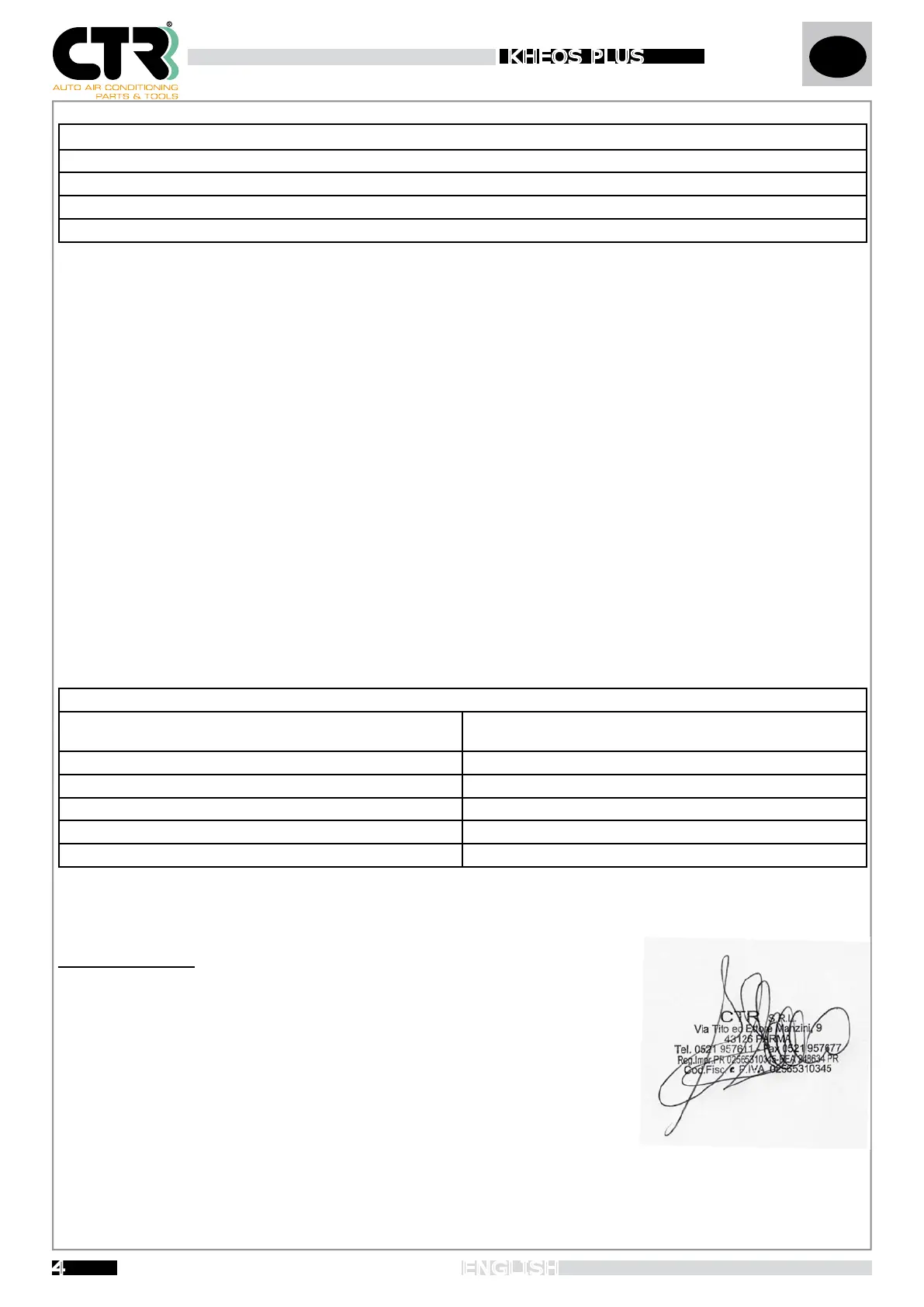 We: CTR S.R.L. Via T. ed E. Manzini n° 9, 43126 Parma (Italy) represented by its Legal Representative, declare on our sole