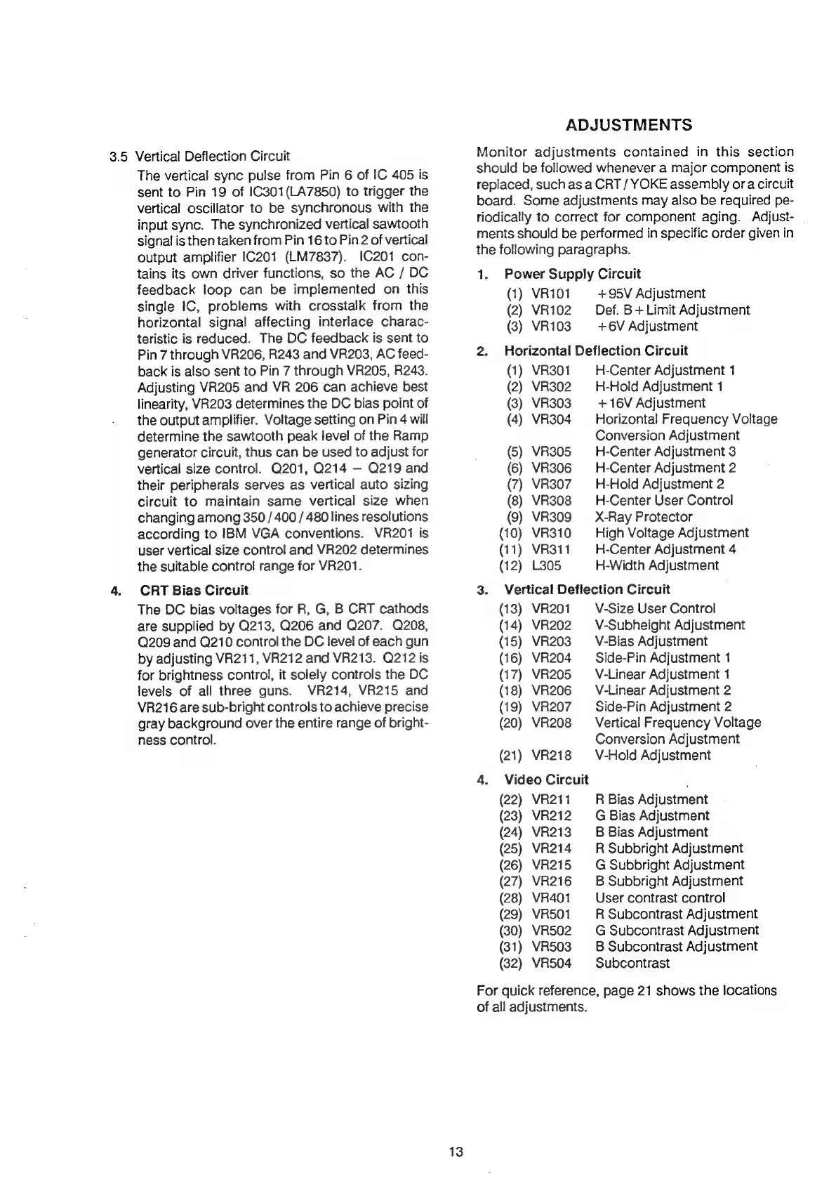 CTX CMS-3435 - Vertical Deflection Circuit; CRT Bias Circuit; Monitor Adjustments; Power Supply Adjustments