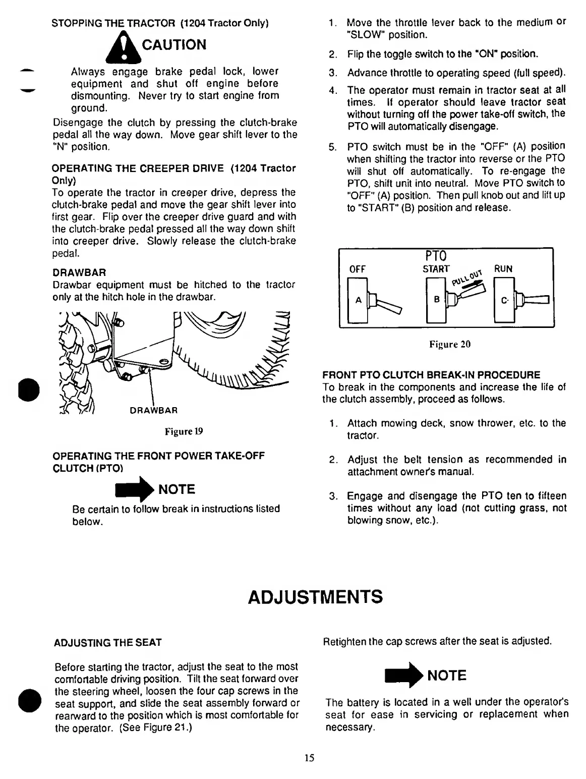 Cub Cadet 1204 - STOPPING THE TRACTOR (1204 Model); OPERATING THE FRONT PTO CLUTCH