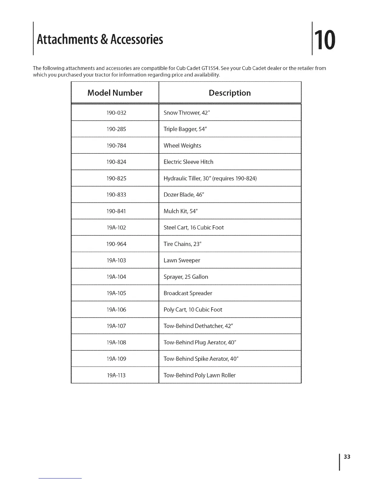 The following attachments and accessories are compatible for Cub Cadet GT1554. See your Cub Cadet dealer or the retailer from