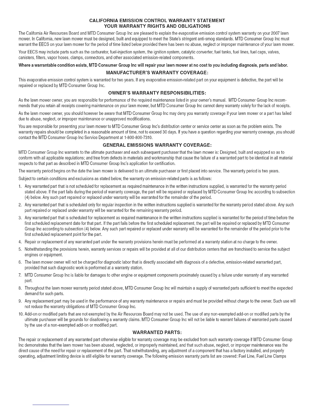 TheCaliforniaAir ResourcesBoardandMTDConsumerGroupInc are pleasedtoexplaintheevaporativeemissioncontrolsystemwarrantyonyour 2007lawn