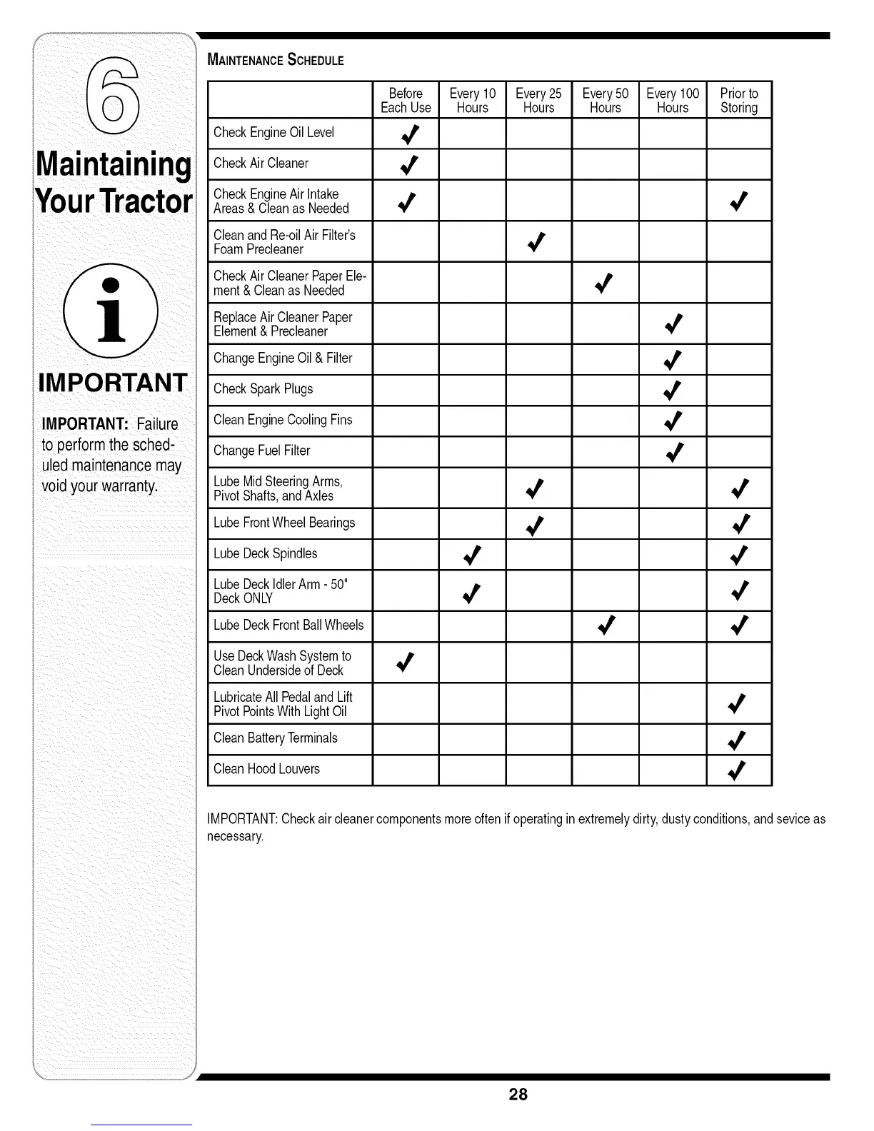 IMPORTANT:Checkair cleanercomponentsmoreoftenif operatinginextremelydirty,dustyconditions,andseviceas