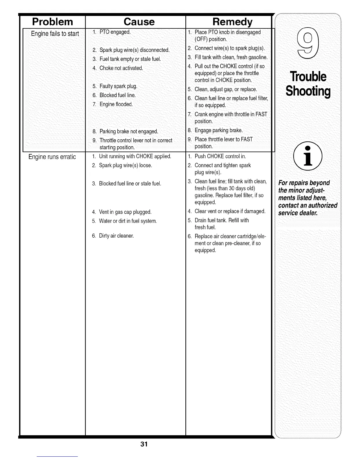 5. Faultysparkplug. 5. Clean,adjustgap,or replace•