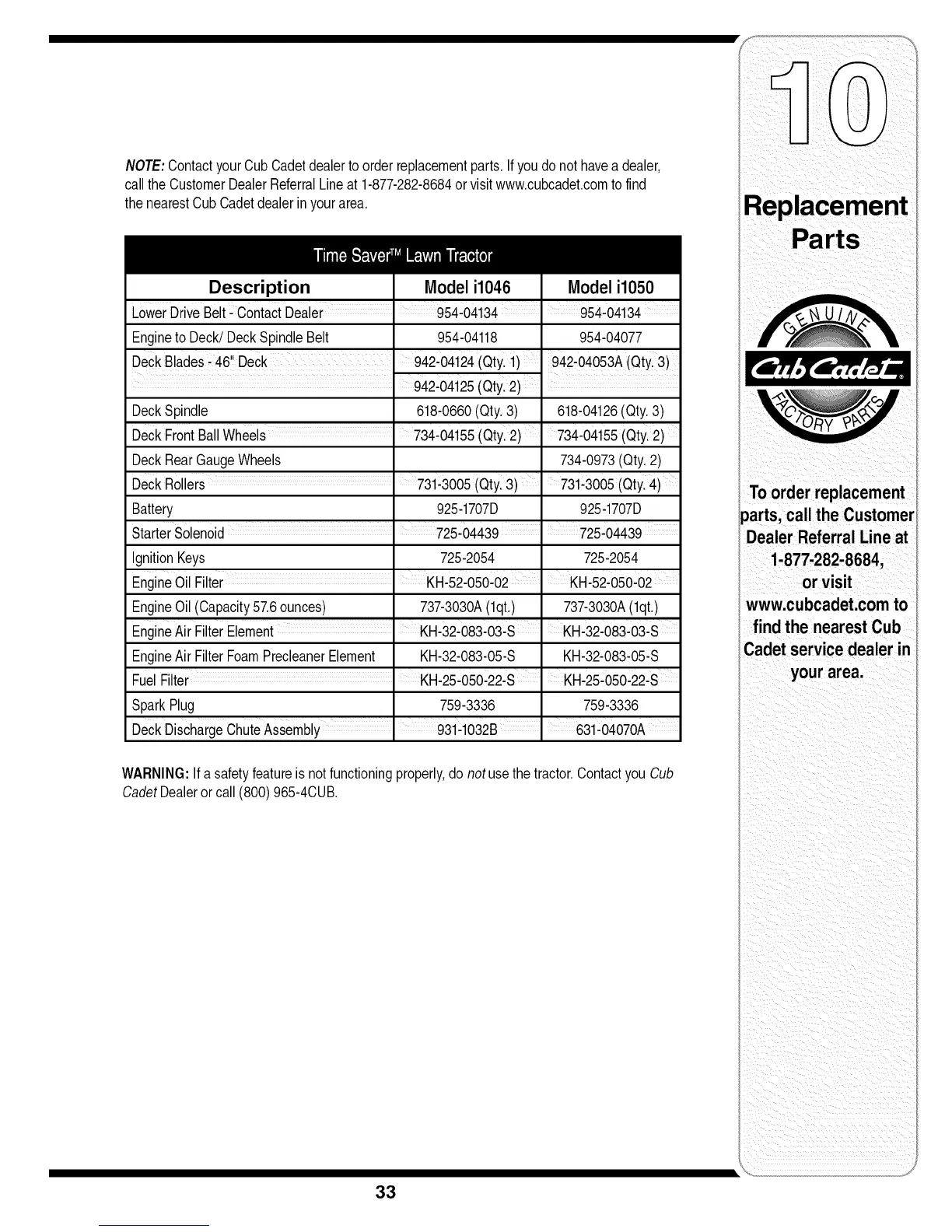 NOTE:ContactyourCubCadetdealerto orderreplacementparts. Ifyou donot havea dealer,