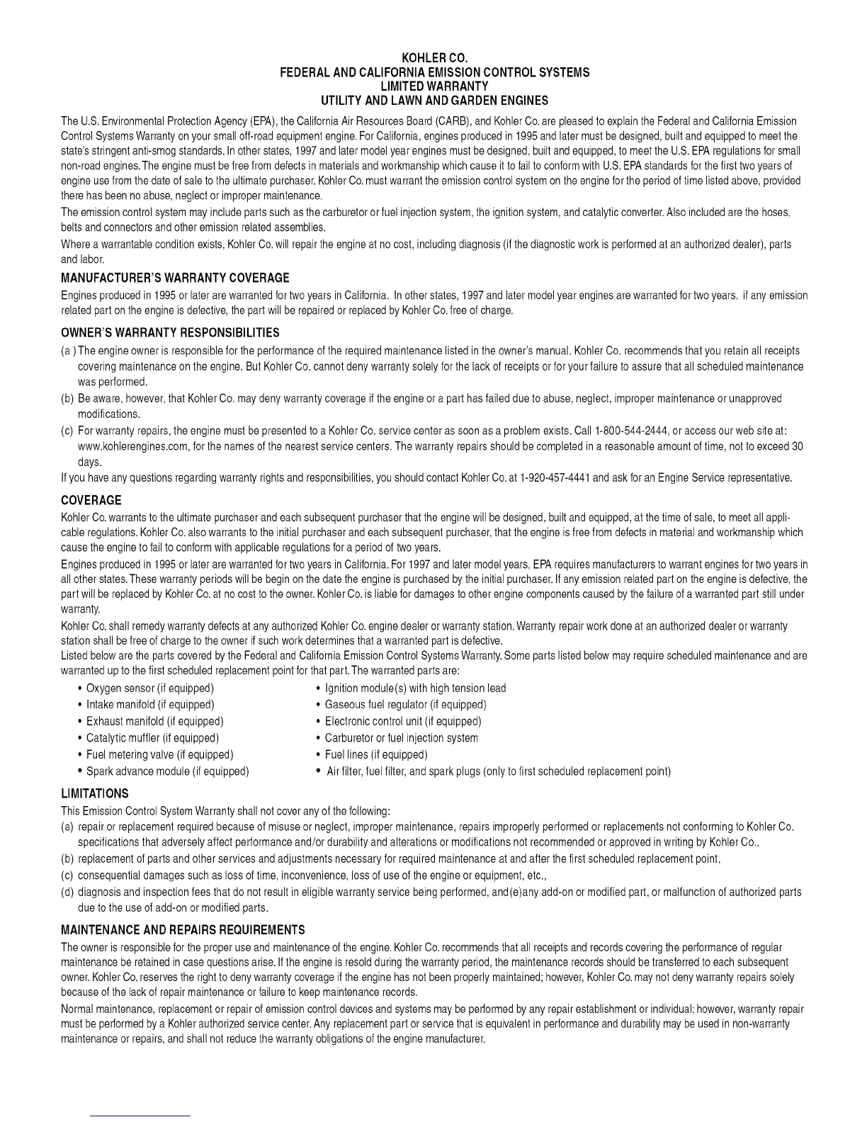 The U.S. Environmental Protection Agency (EPA), the California Air Resources Board (CARB), and Kohler Co.are pleased to explain the Federal and California Emission