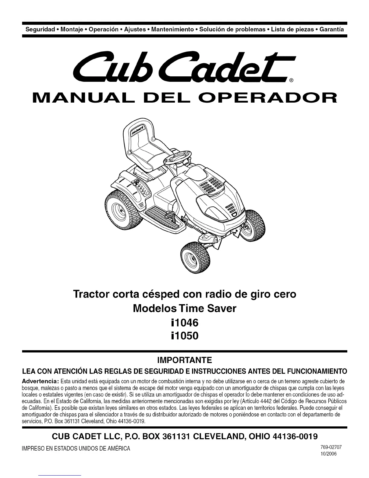 Seguridad • Montaje • Operaci6n • Ajustes • Mantenimiento • Soluci6n de problemas • Lista de piezas • Garantia