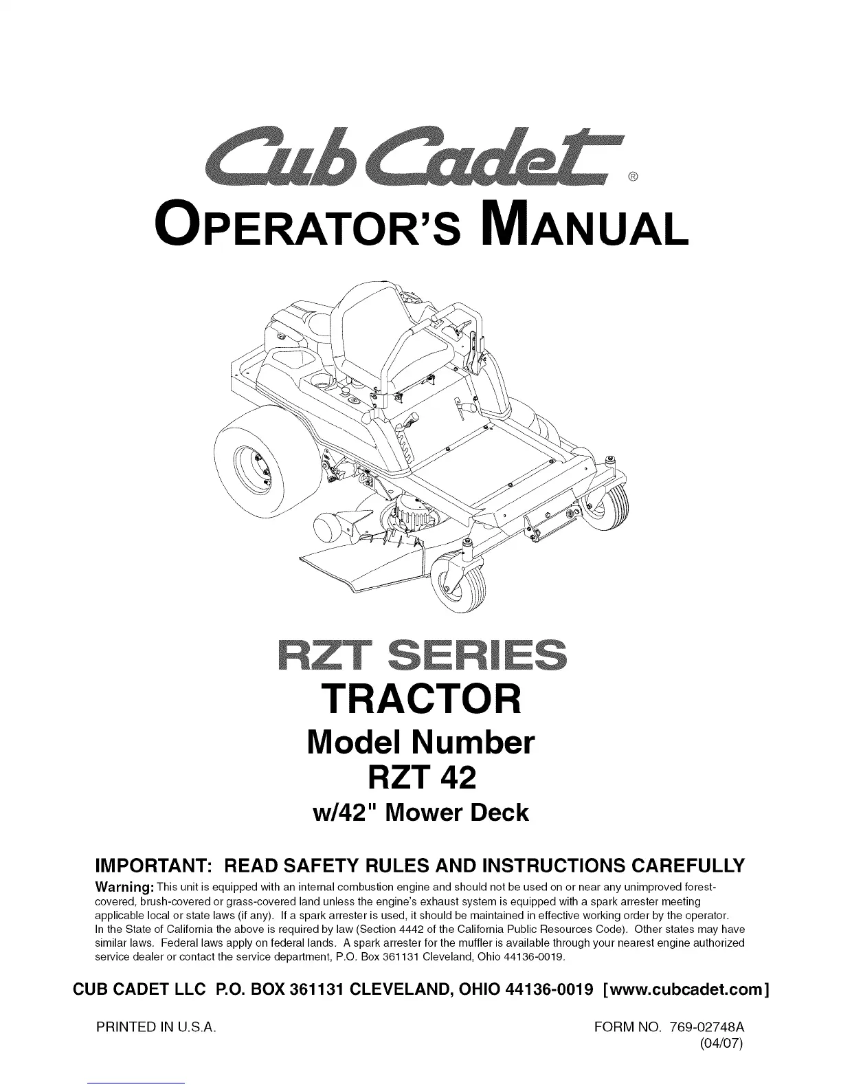 CUB CADET LLC P.O. BOX 361131 CLEVELAND, OHIO 44136-0019 [www.cubcadet.com]