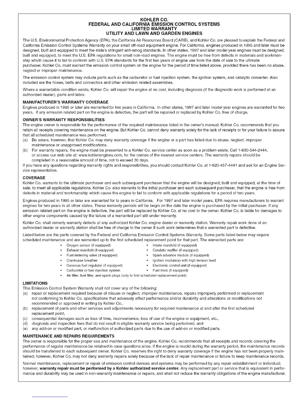emission related part on the engine is defective, the part will be replaced by Kohler Co. at no cost to the owner. Kohler Co. is liable for damages to