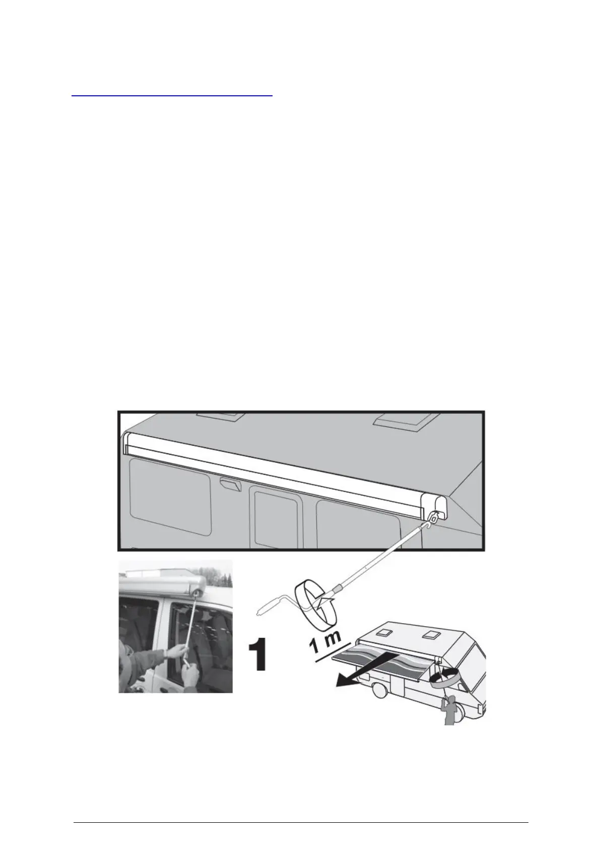 1. Use the awning handle to unwind the awning. Use the legs 1 metre out to avoid strain