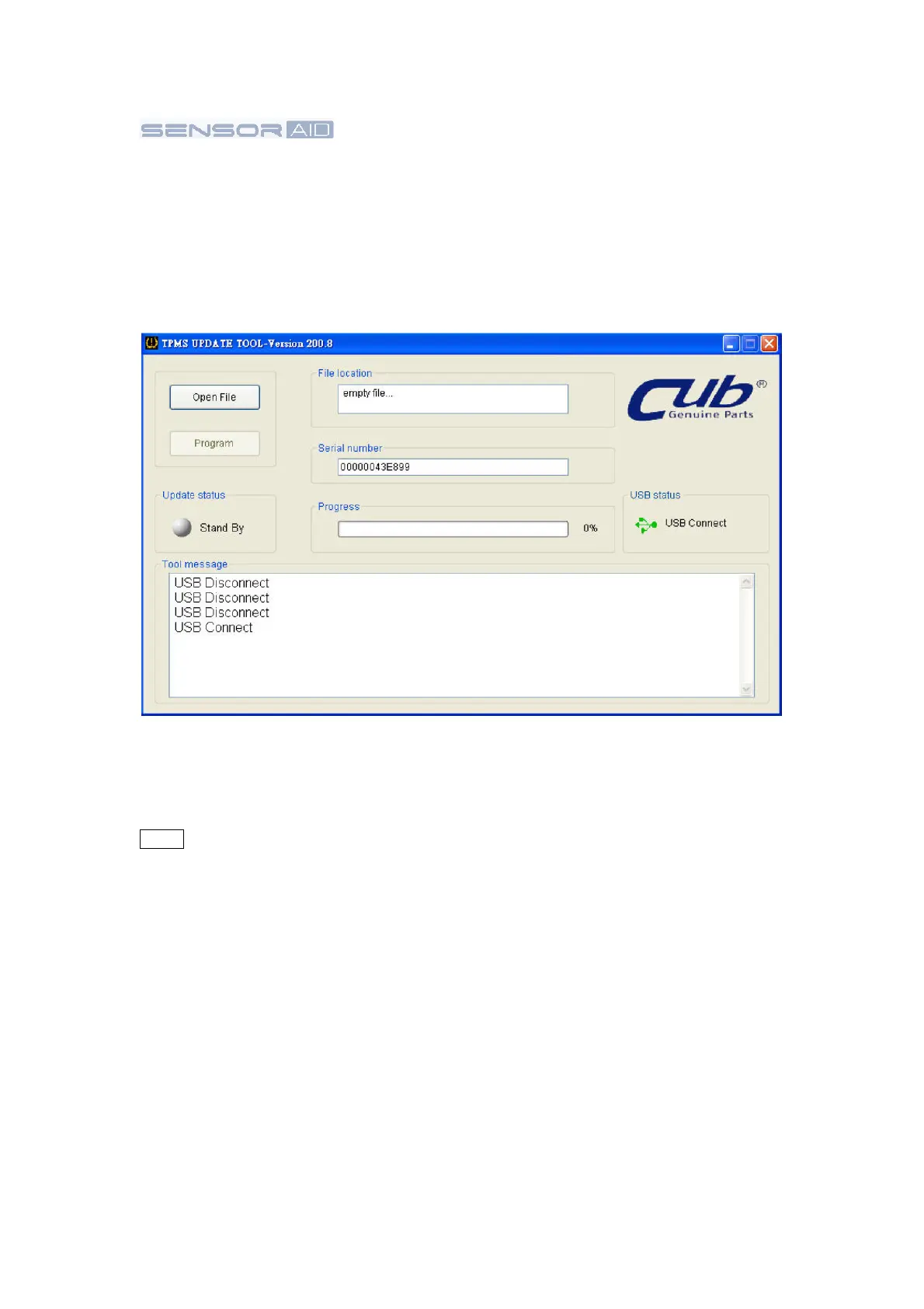 1. Connect the USB cable from Sensor AID to the PC, Click on the CUB TPMS update icon to