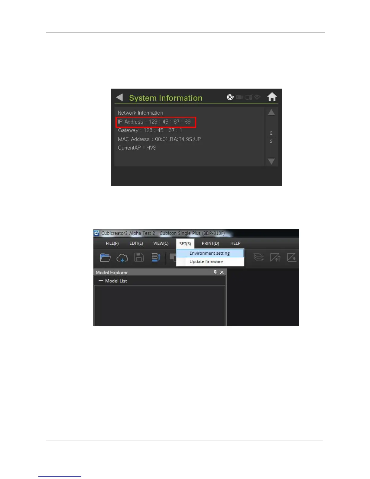 User can check current printer IP on 2/2 screen by pressing System information on the main