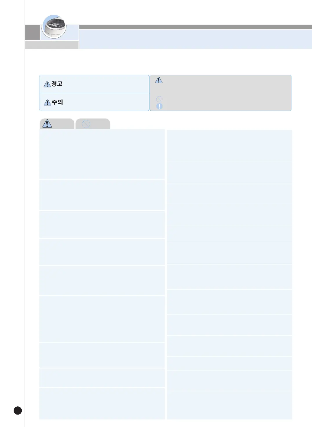 ‘안전상의 경고’는 제품을 안전하고 올바르게 사용하여 사고나 위험을 미리 막기 위한 것이므로 반드시 지켜 주십시오.