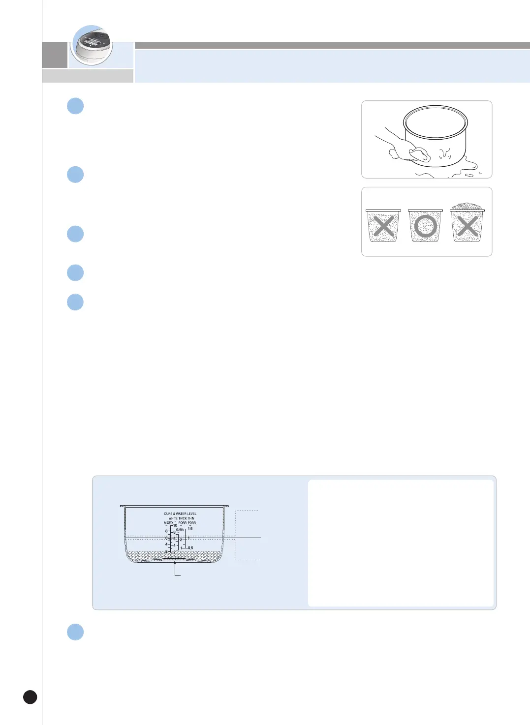 • MIXED RICE: Adjust water based on 'MIXED RICE` water level line. Max.8 persons for MIXED RICE.
