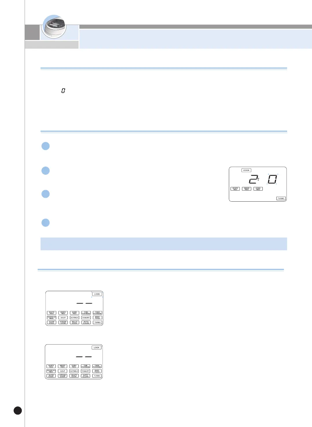 - 높은단계 : 잡곡류 및 묵은쌀로 취사하실 경우나 차진밥을 좋아하실 경우에 설정해 주십시오.