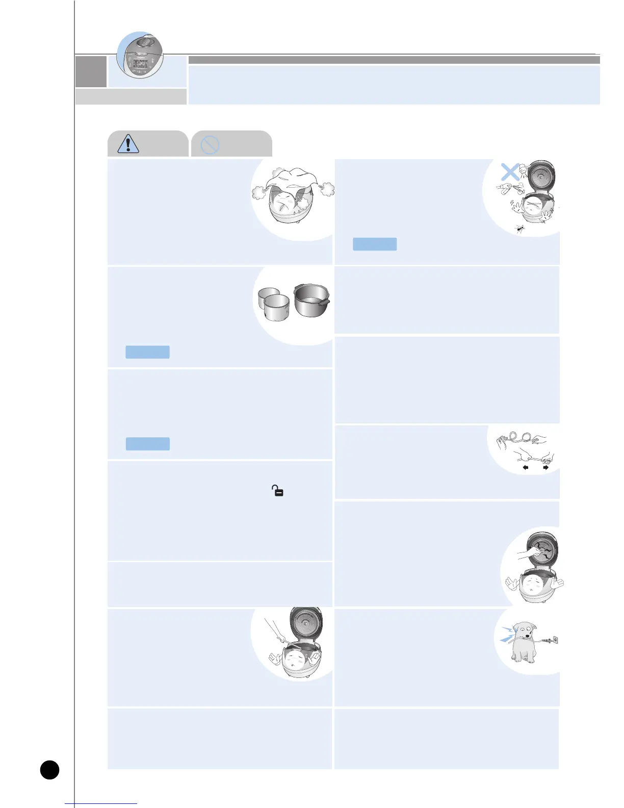 •내솥이 없는 상태에서 쌀이나 물을 넣지 마십시오.