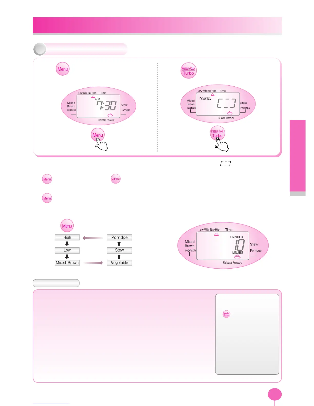 백미저압 : 일반밥솥보다는 더 찰지고 백미고압보다 덜 찰진 밥을 취사할 때 사용합니다.