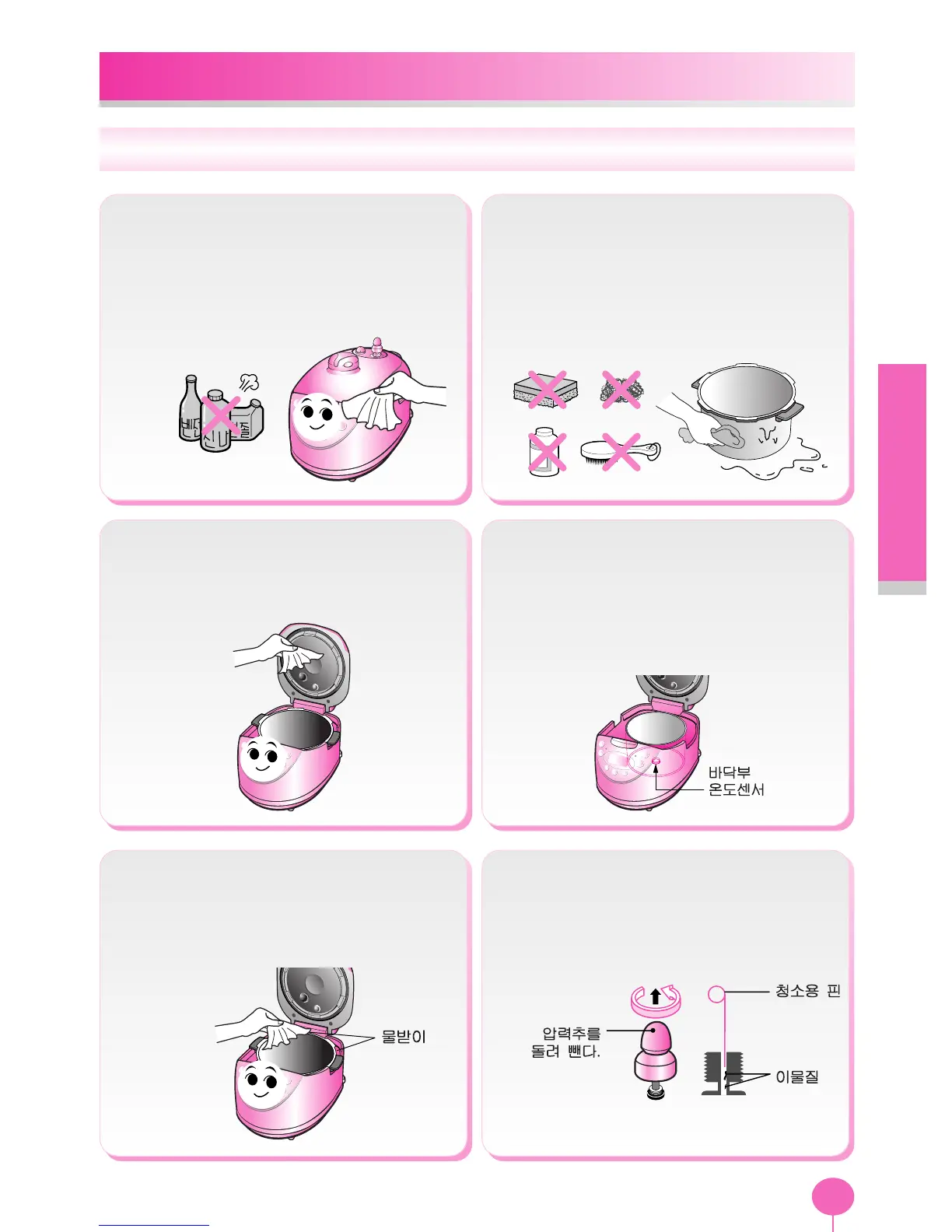 ※ 손질을 할때는 반드시 물기가 없는 손으로 전원플러그를 빼고 본체의 열이 식은 후에 손질하십시오.