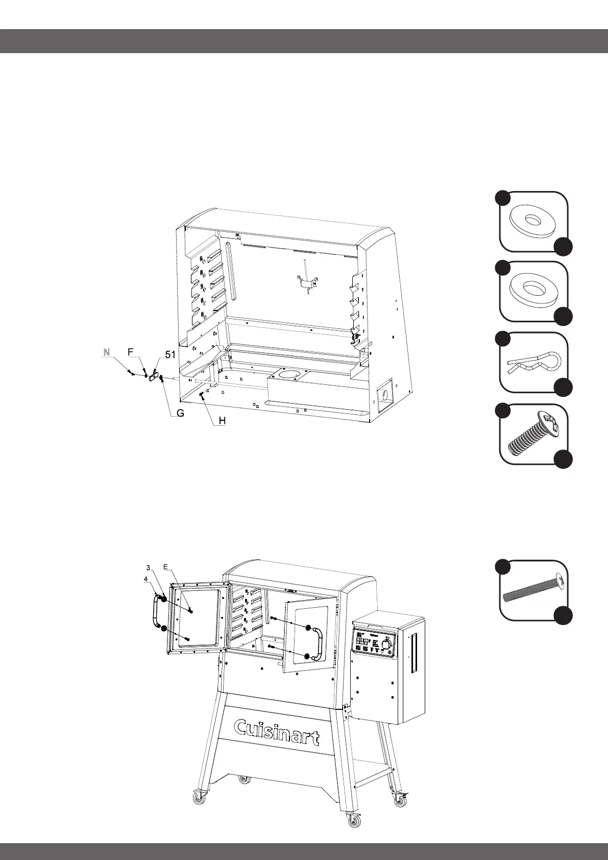 On the outside assemble to the rod in order: Insulative Washer (G), Ash Cleaning Rod Handle (51), Flat