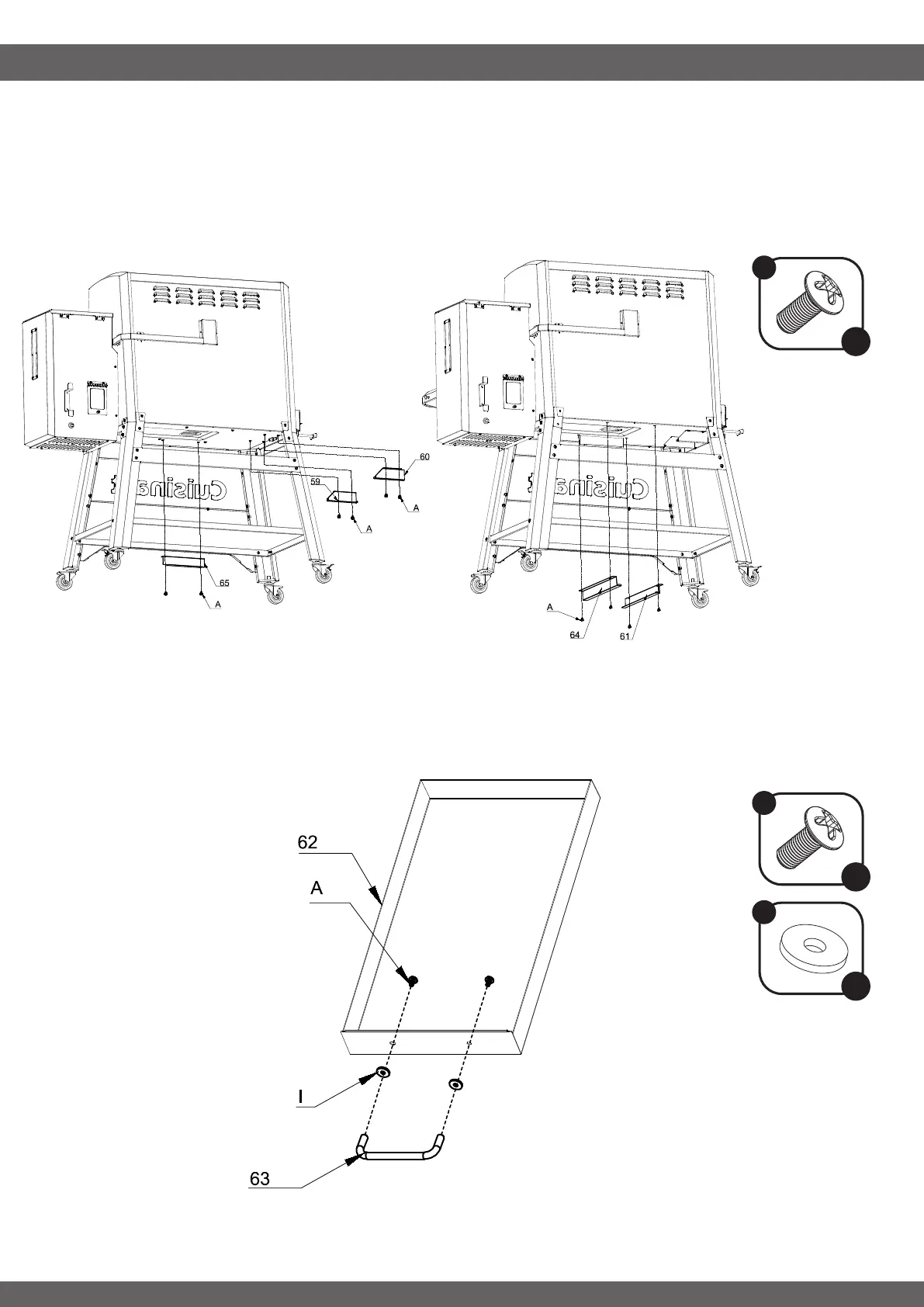 Attach the Ash Drawer Handle (63) to the Ash Drawer (62) using 2x Screw (A) and 2x Insulative Washer (I).•