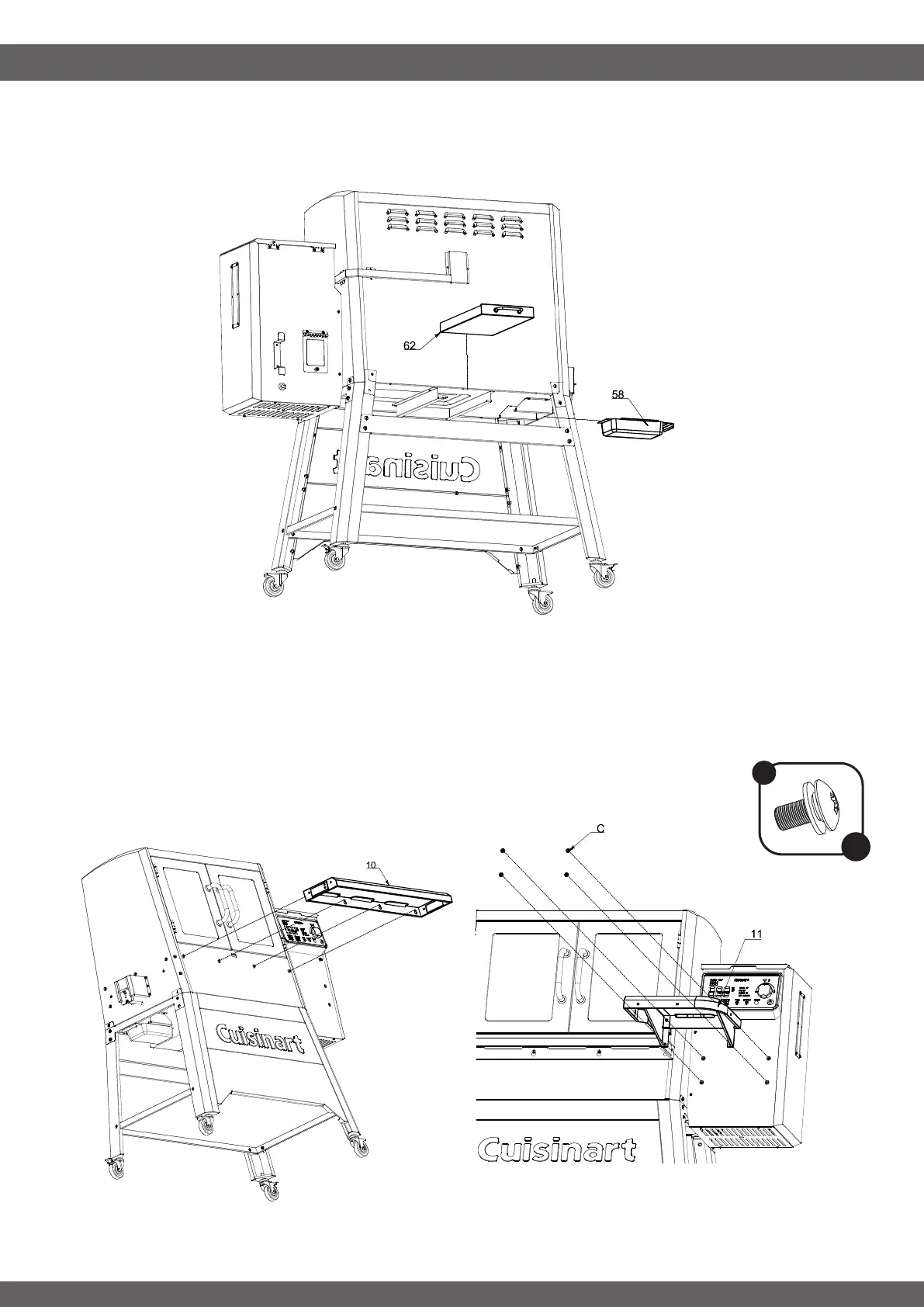 Insert the Ash Drawer (62) and the Grease Tray (58) into their respective locations. •