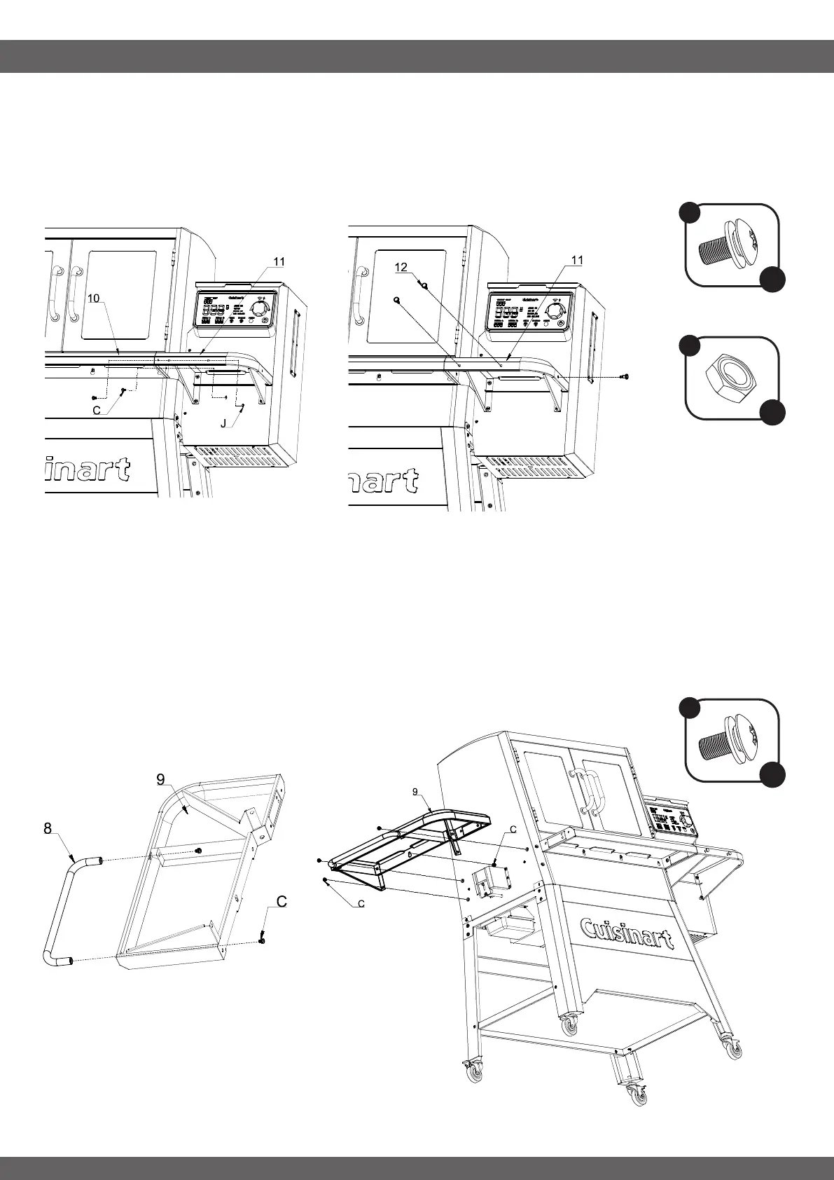Fasten Main Handle (8) to Left Table (9) with 2x Lock Screw (C).•