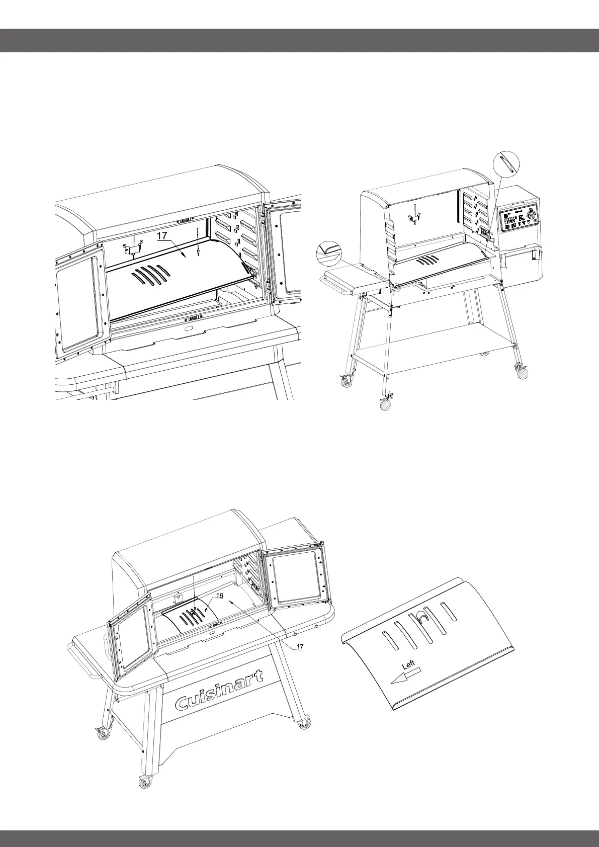 Insert the Drip Shield (17) into the cooking chamber. There are tabs on the right side of the cooking chamber •