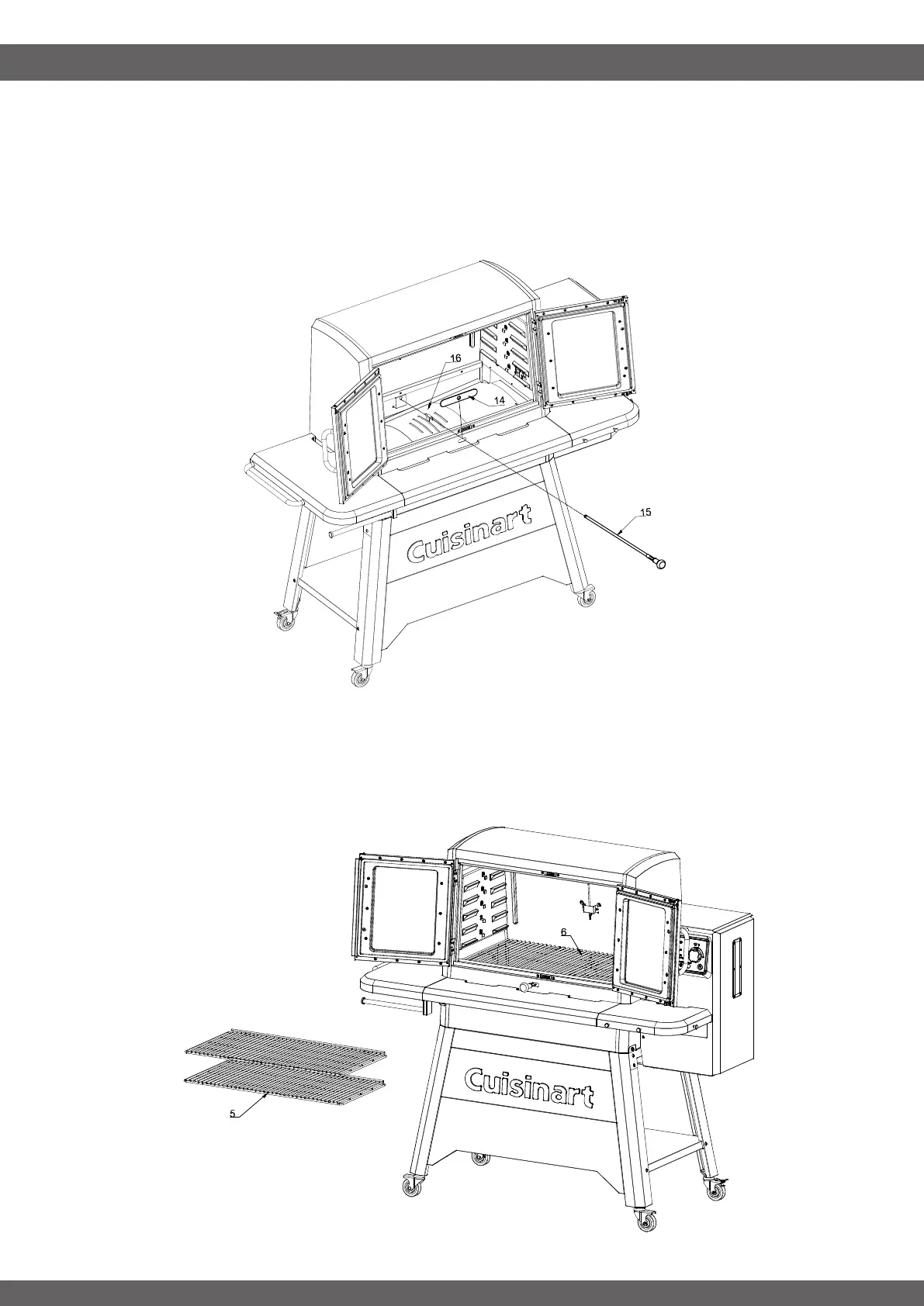 Insert the 3x Cooking Grates (6) into the bottom of the cooking chamber. When those are in, slot the 2x •
