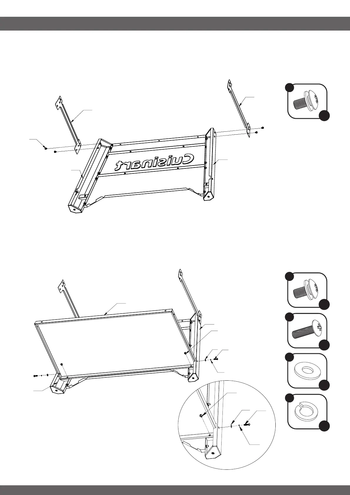 Assemble the Left Cart Bracket (24) and the Right Cart Bracket (25) to the two front legs using 4x Lock •