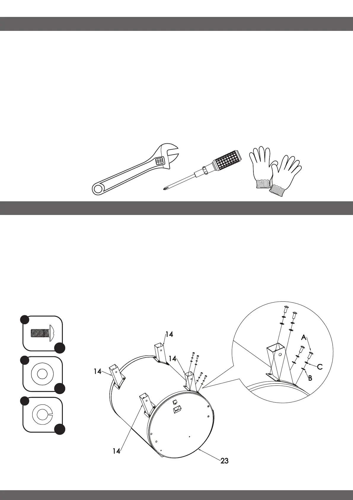 Tools required for assembly: Wrench, Phillips Head Screwdriver and Gloves (NO TOOLS ARE INCLUDED).
