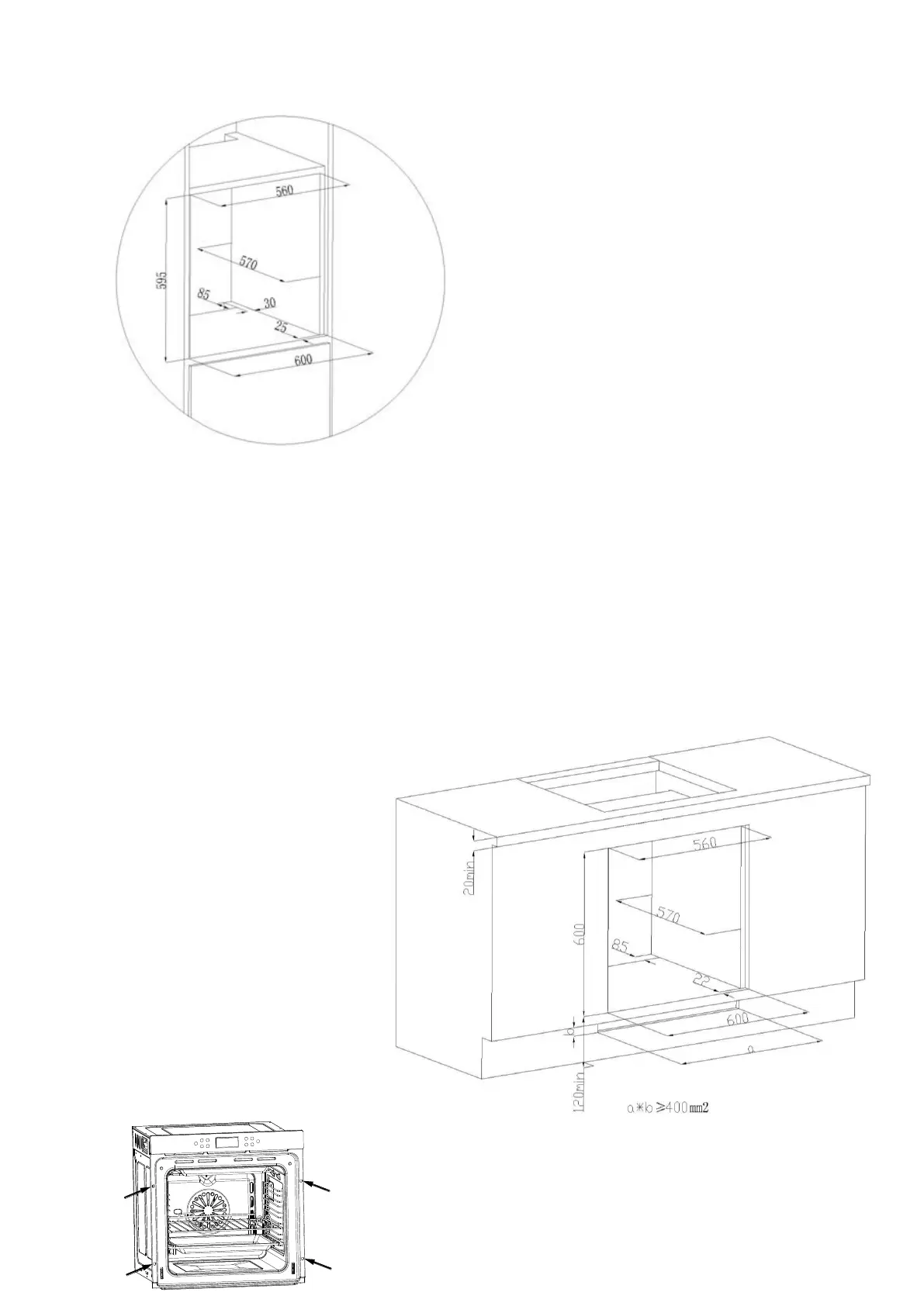 ⚫ The oven must be fitted into an oven housing with the ventilation cut-outs shown in the