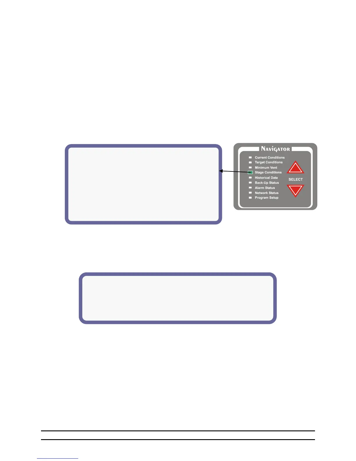When the Stage Conditions screen is selected by using the Navigator Select arrows, the following menu