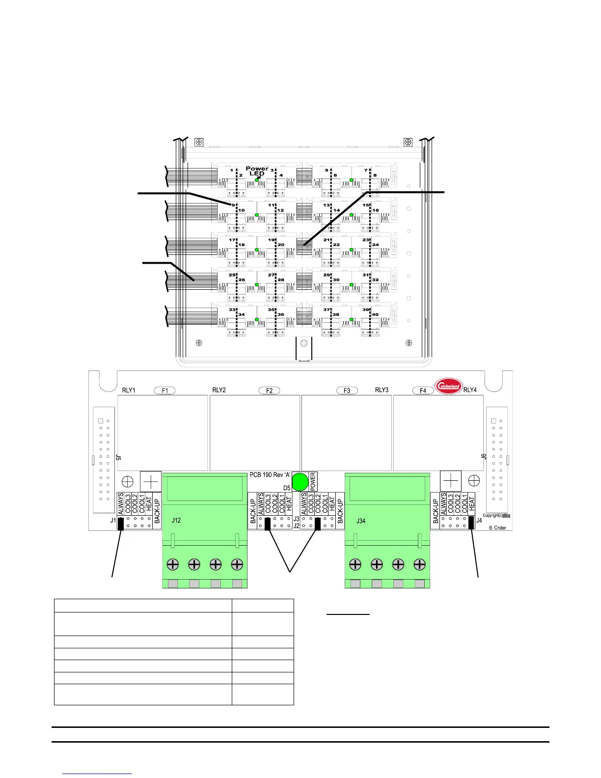jumper for each relay. The stage jumpers are labeled ALWAYS, COOL 1, COOL 2, COOL 3, and HEAT. Location