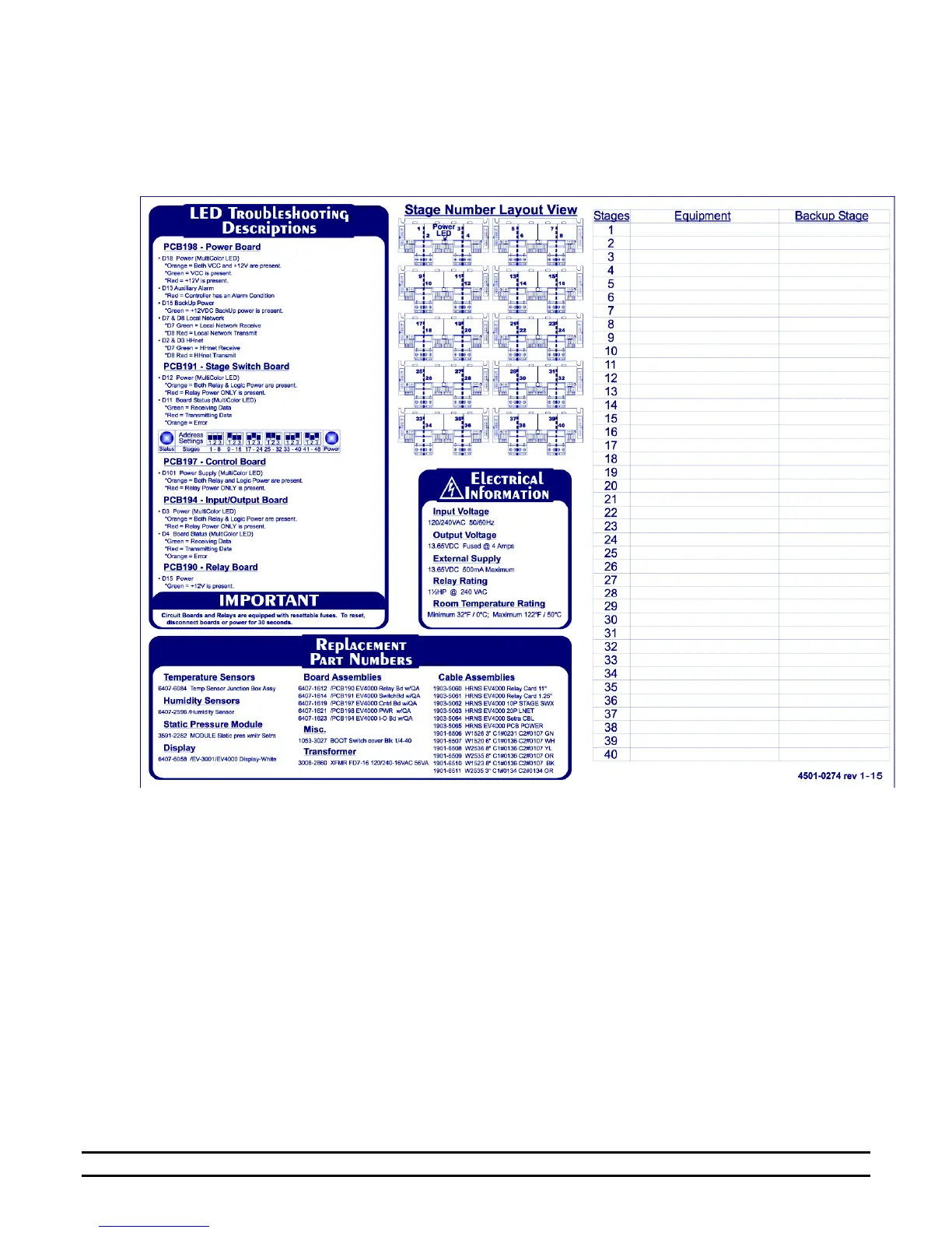 location of the stage relay connections, electrical information, and most of the main replacement part numbers.