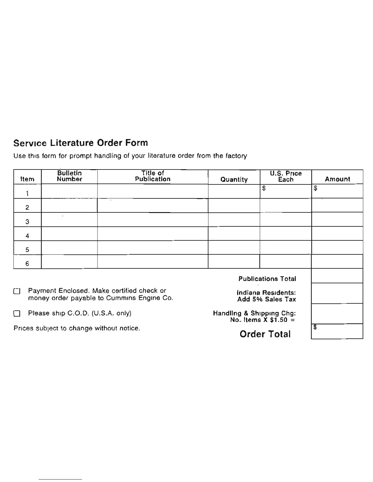 CUMMINS 5.9 - Service Literature Order Form