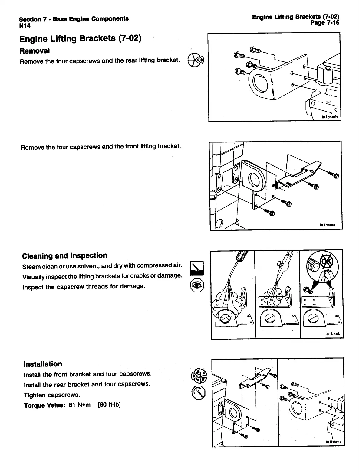 CUMMINS N14 - ENGINE LIFTING BRACKETS; REMOVAL; CLEANING AND INSPECTION; INSTALLATION