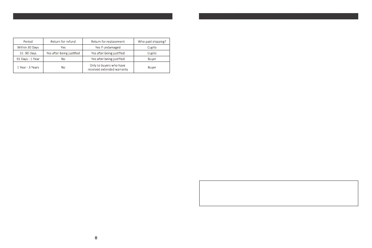 Cupilo products can be repaired or replaced within warranty period or returned for refund